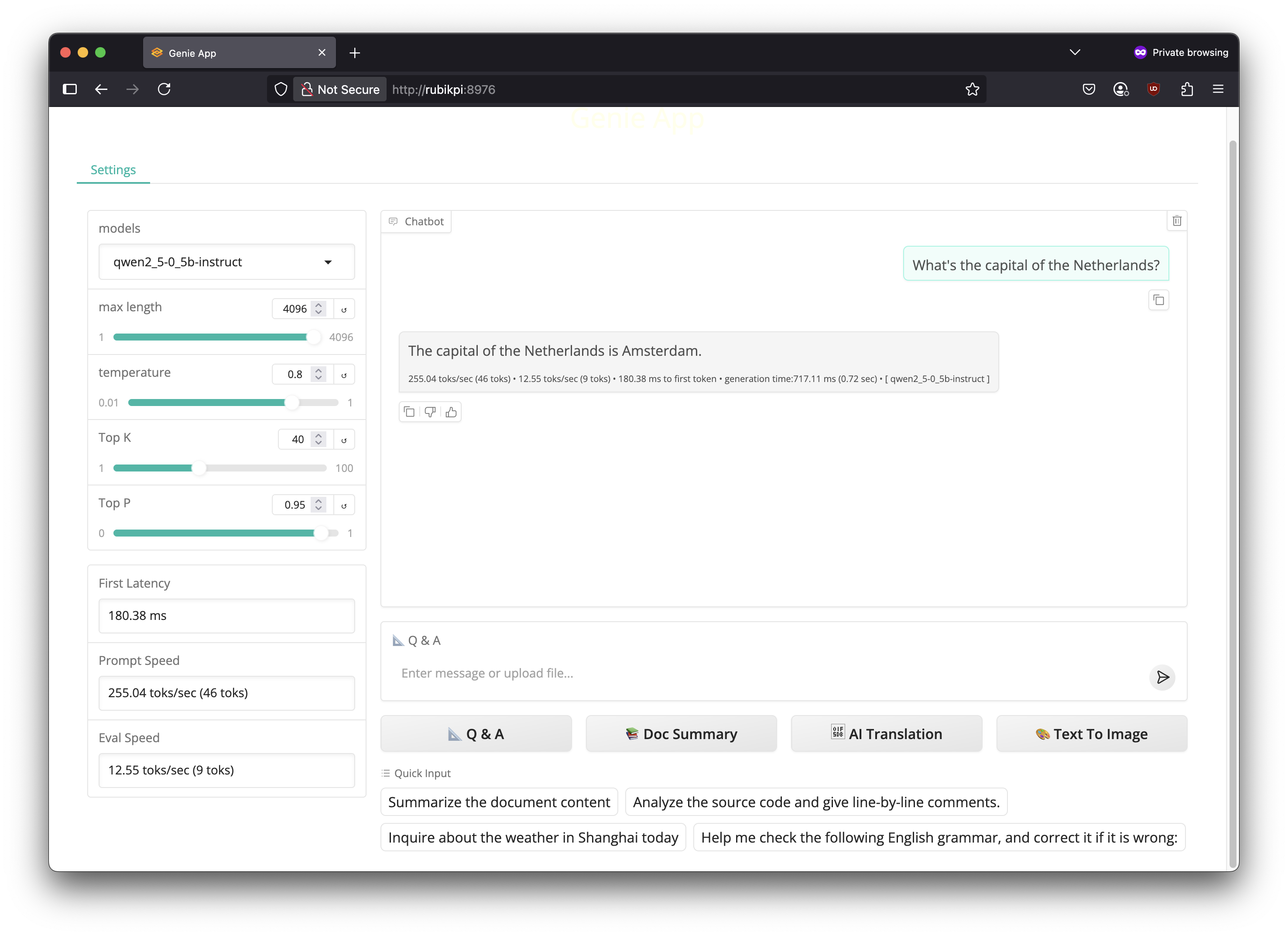 要在你的应用程序中使用 Genie 模型,您可以使用 QAI AppBuilder 库。AppBuilder repo 既有与 OpenAI 兼容的会话补全 API,也有与您的模型交互的 Web UI(类似llama.cpp )。