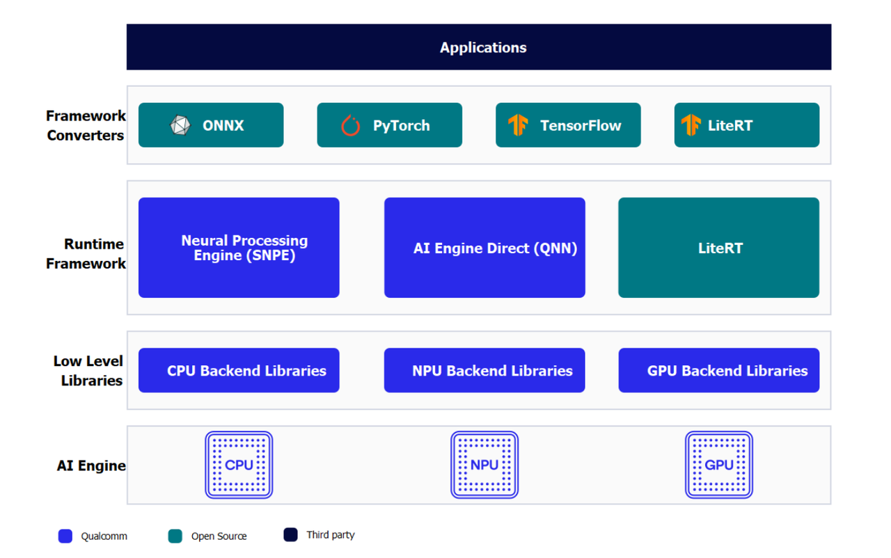 该架构旨在提供统一的 API ,模块和可扩展的预加速库,从而基于这种可重用的结构打造全栈 AI 解决方案。它可为Qualcomm 神经网络处理 SDK(SNPE) 、 TFLite AI Engine Direct Delegate 等运行时提供支持。