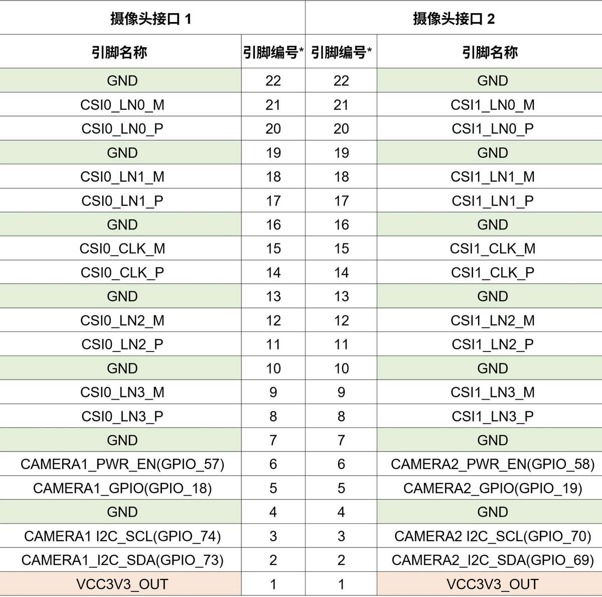 摄像头接口引脚定义如下表: