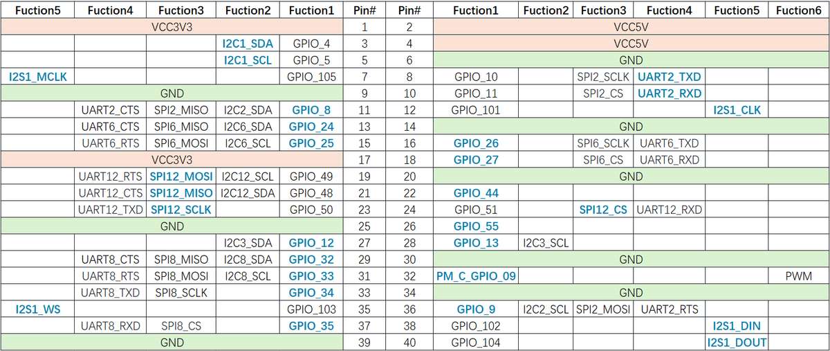 下表是 40-pin连接器支持的所有功能,图中蓝色字体表明默认功能。