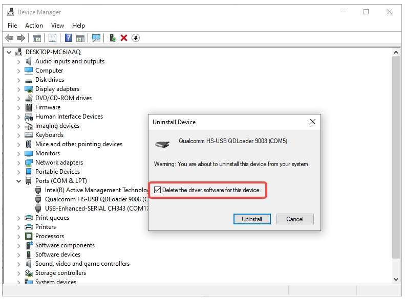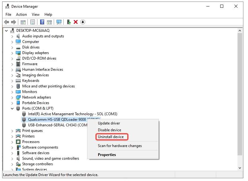 卸载该设备的其他驱动程序。确保未安装 Qualcomm USB 驱动程序等驱动程序。
