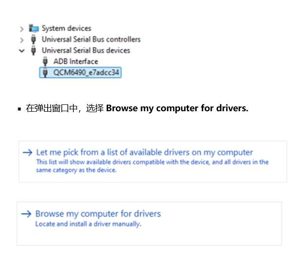 - 在设备管理器中右键 RUBIK Pi 的 USB 端口,选择更新驱动程序。