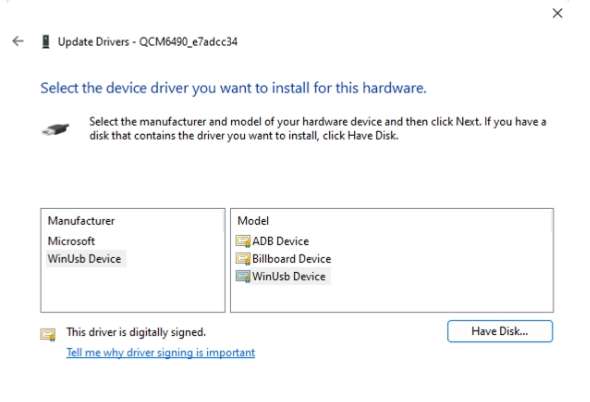 - 在通用串行总线设备中,选择 "WinUsb Device"。