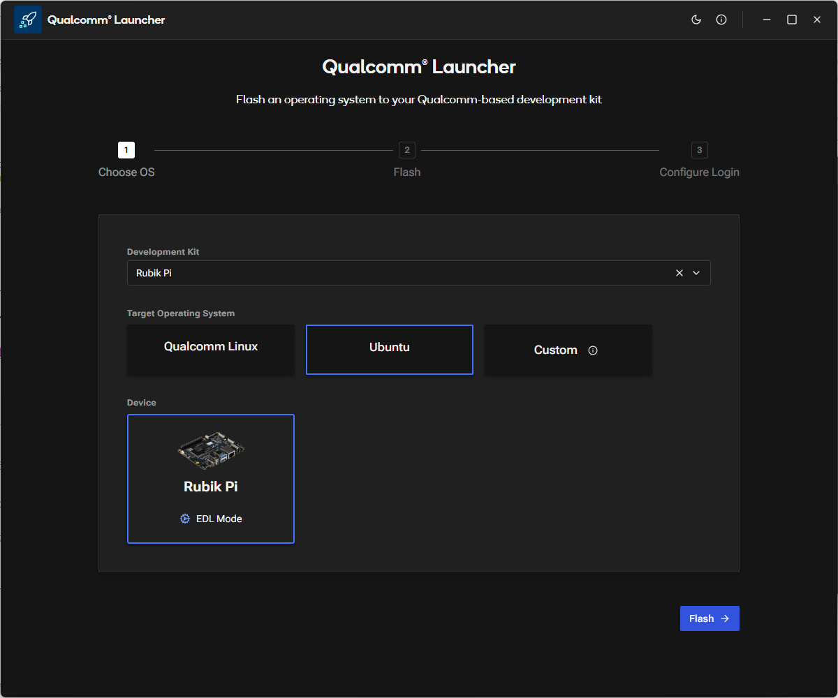 a. In the Launcher, select the Development Kit as RUBIK Pi and the Target Operating System as Ubuntu.