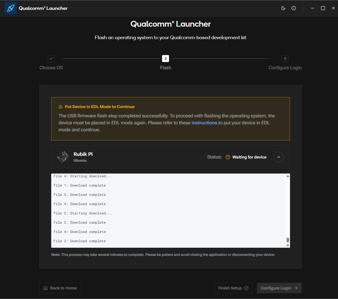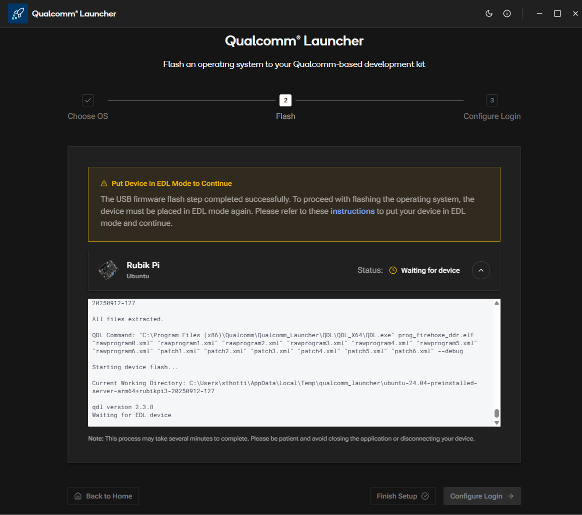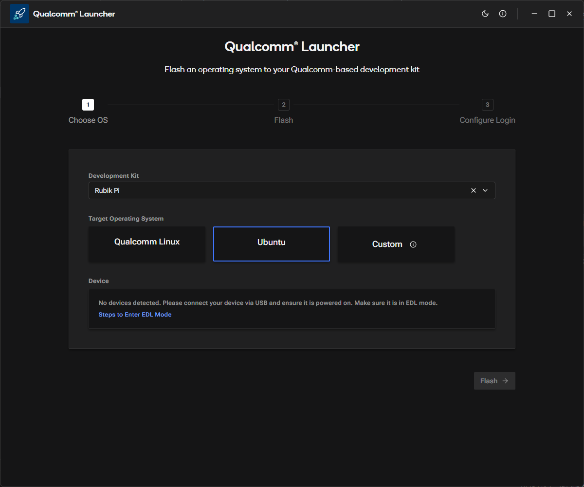 b. Switch the device to EDL mode (you can find instructions within the app). Once in EDL mode, the RUBIK Pi 3 will be automatically detected.