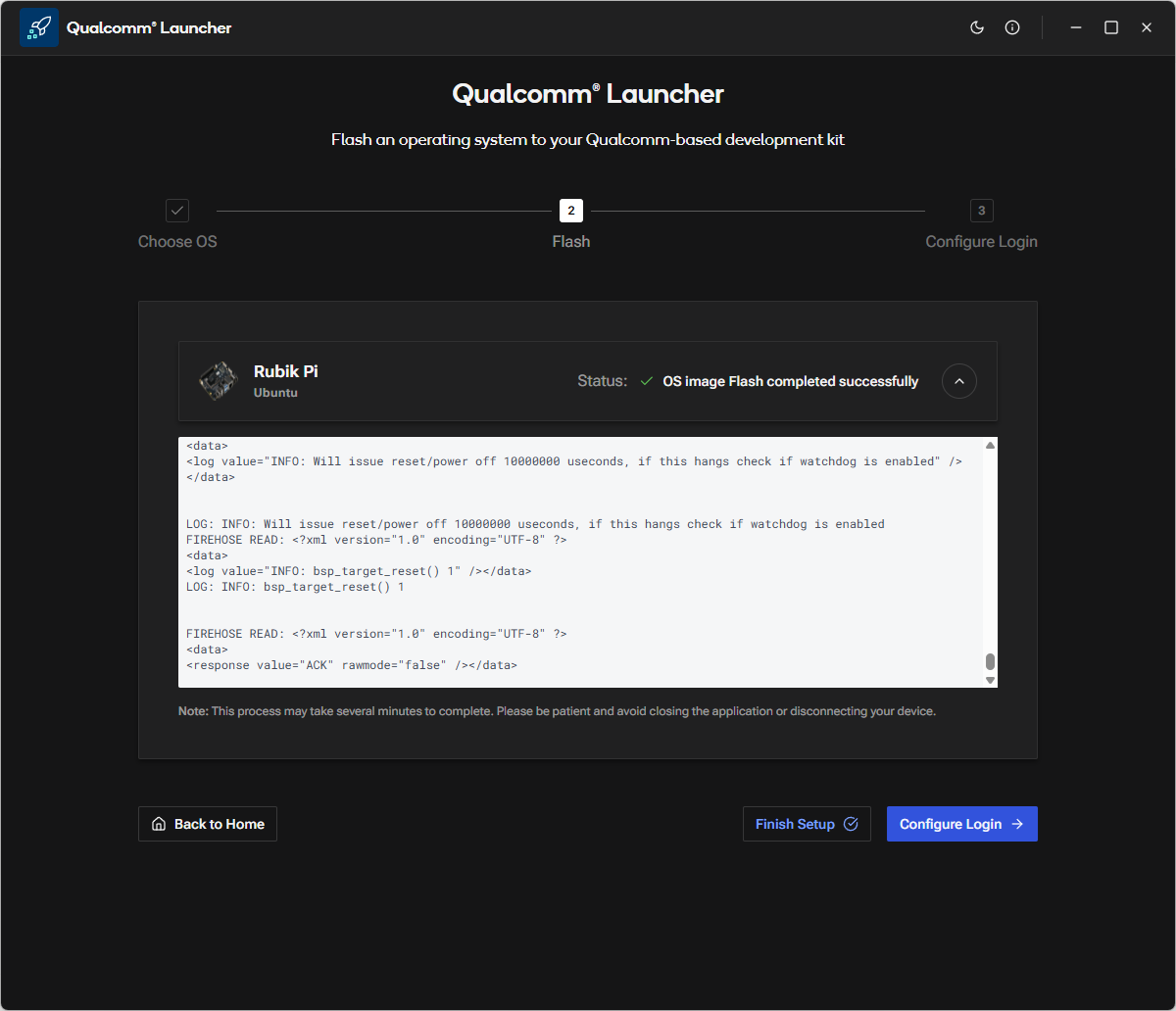 a. After the OS image flashing is complete, the launcher will reboot RUBIK Pi 3 device into the newly installed operating system. You can now proceed to configure the device.