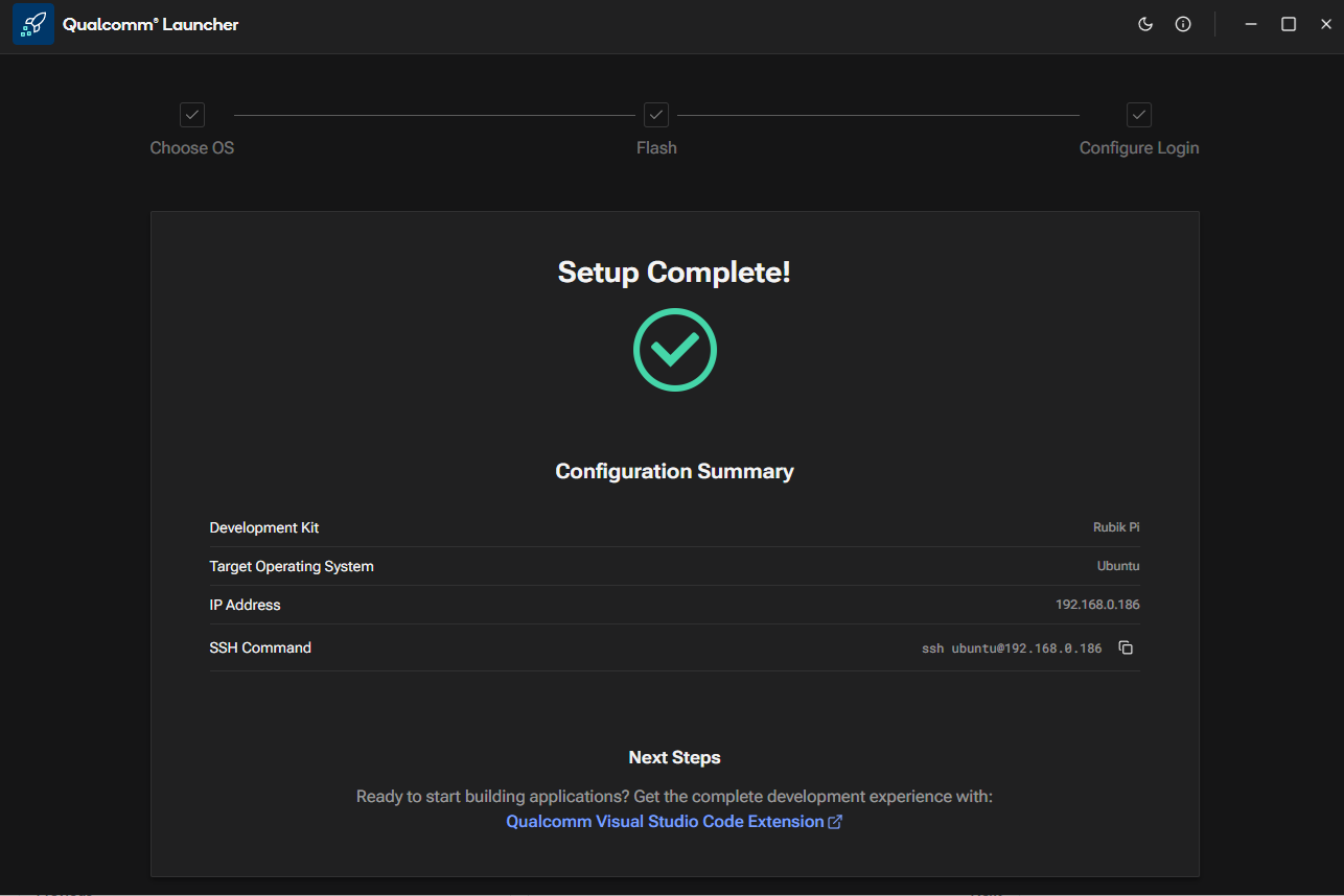 IDE Method: You can create AI and multimedia applications on the Qualcomm®-based RUBIK Pi 3 Development Kit using the Qualcomm® Visual Studio Code Extension. It’s an integrated application development environment for Qualcomm development kits. The extension runs in Ubuntu (or WSL with Ubuntu) and facilitates device configuration, software development including compilation, debugging, and binary flashing.