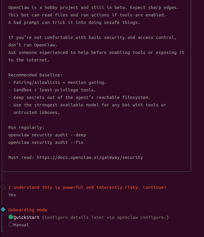 For Onboarding mode, select QuickStart and press Enter;