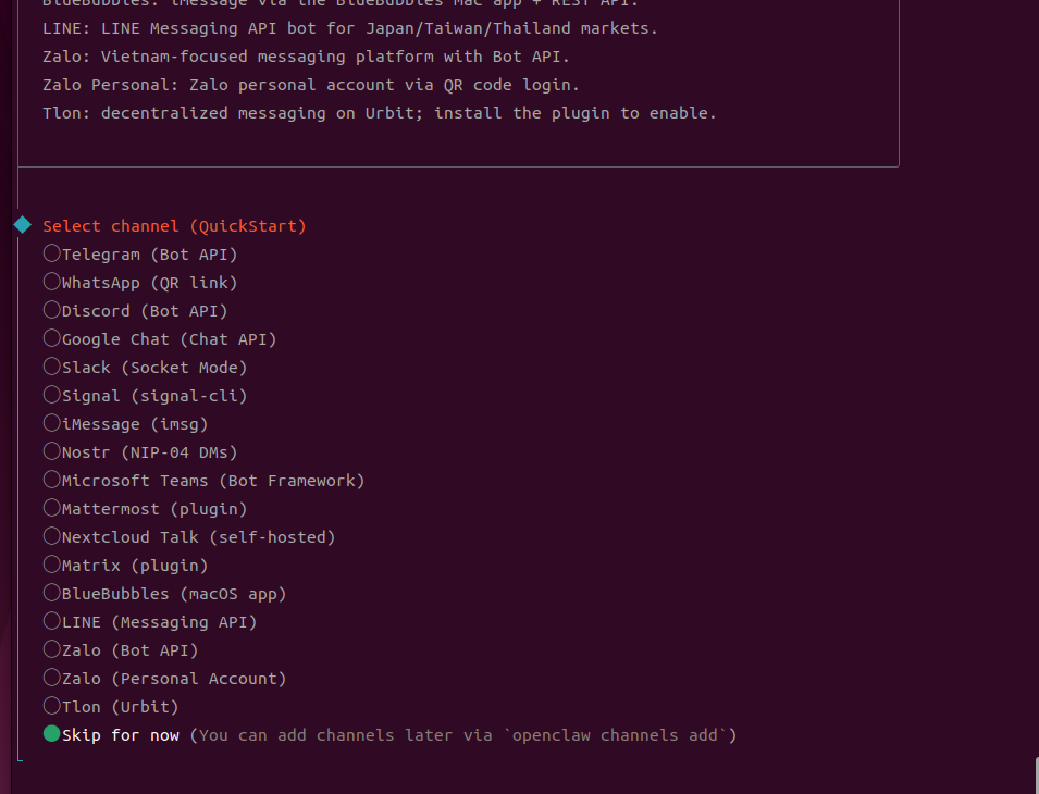 | 6 | Configure channels (WhatsApp, etc.) | Skip for now (can be configured later in Web UI) |