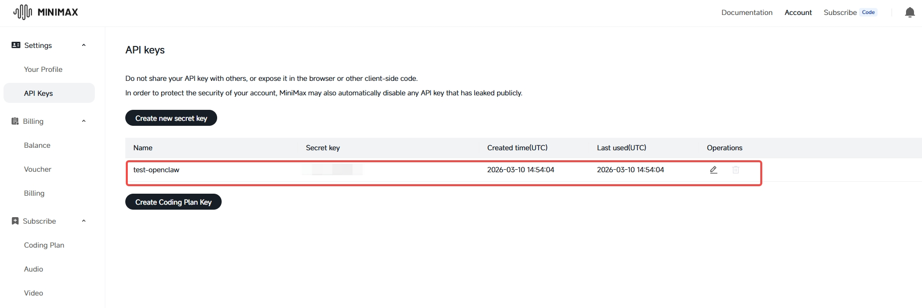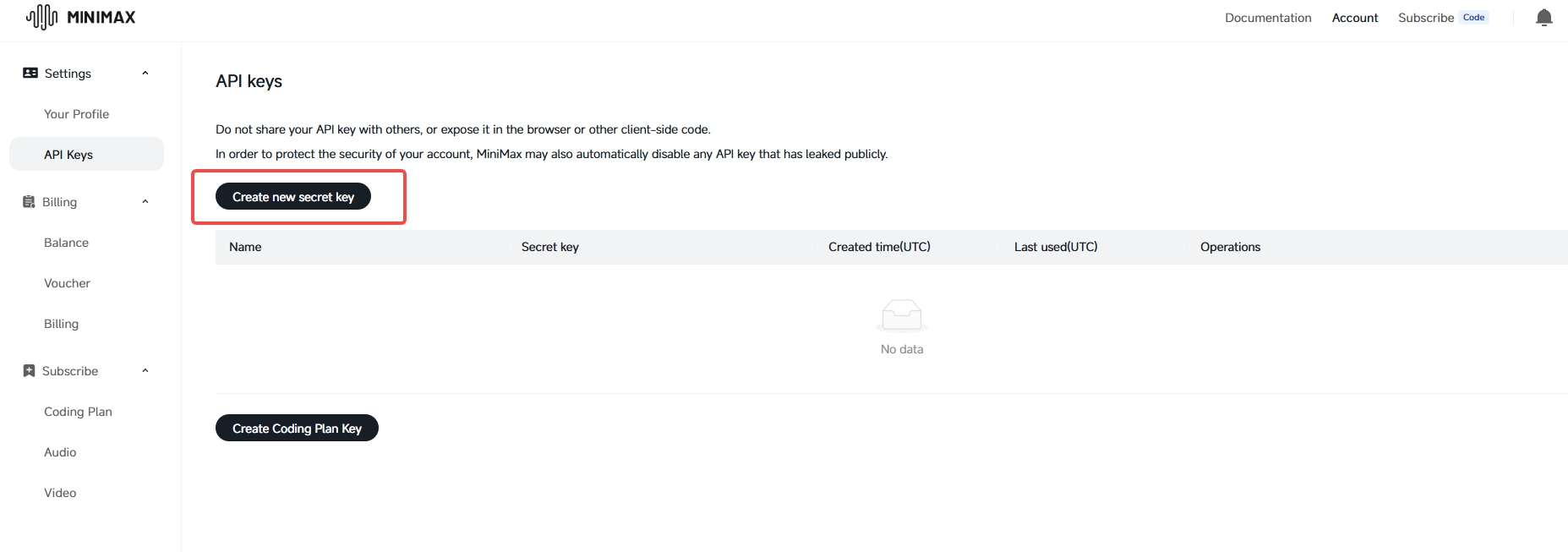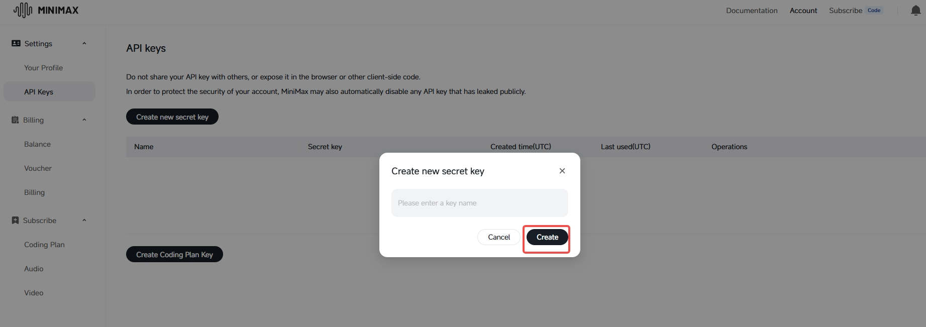 - In the open platform, go to Account > API Keys > Create new secret key.