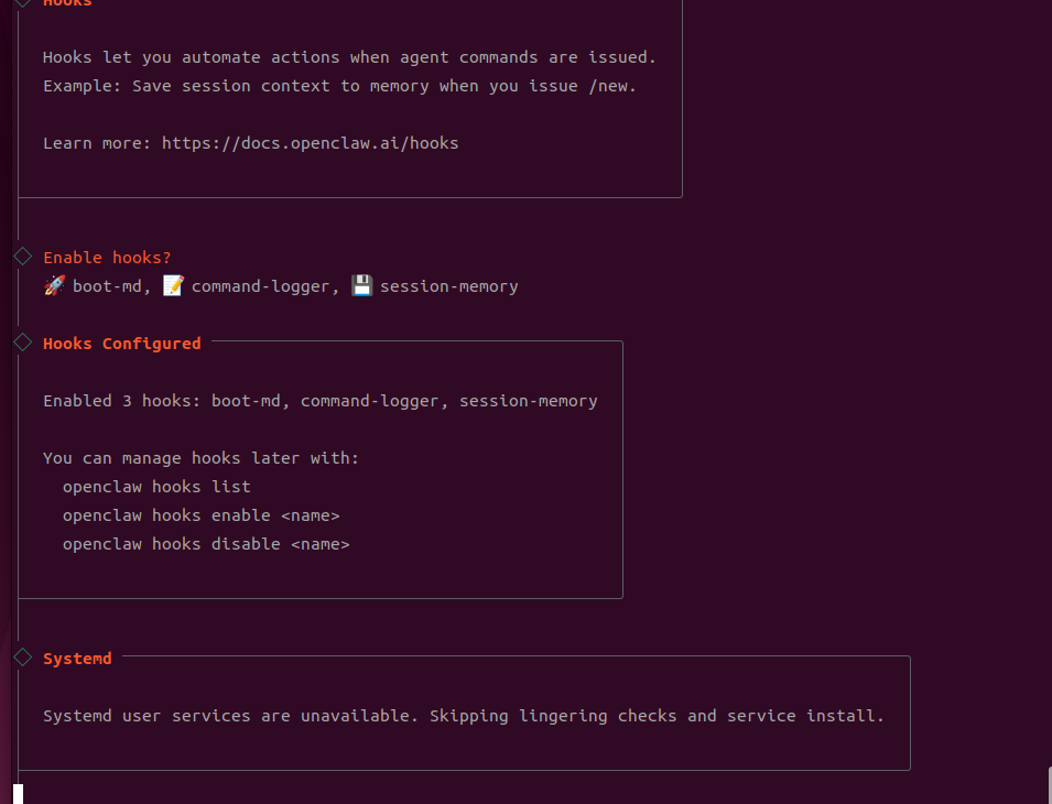 For Enable hooks, select all three options below using the space bar and press Enter to install (if no Hooks option appears, you can also configure later in web);
