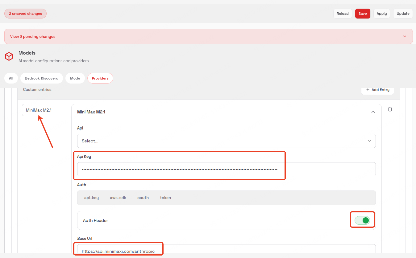 The complete configuration steps, using MiniMax M2.1 as an example, are as follows: