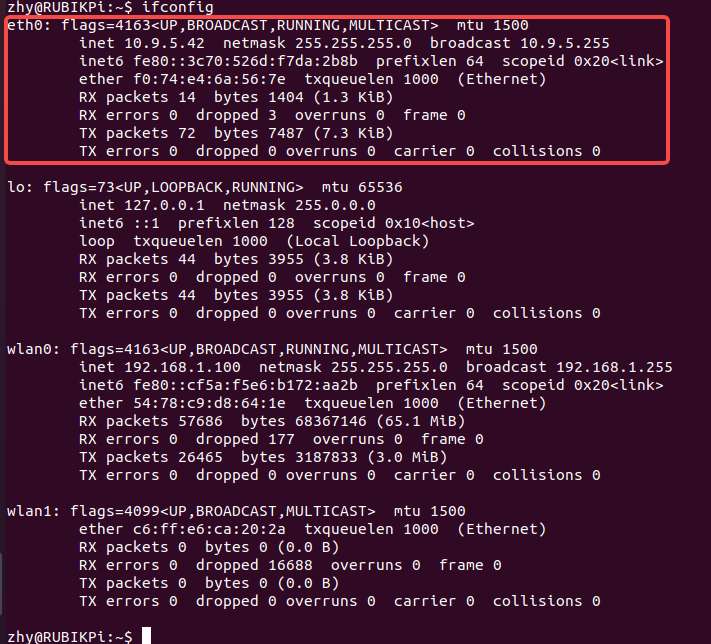 Run the ifconfig command on RUBIK Pi 3 to check the network connection. As shown in the following figure, the IP address has been successfully assigned, indicating that the network connection is successful: