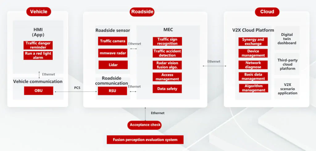 The overall architecture includes three ends: vehicle, road, and cloud. Road realizes the perception and fusion of traffic information based on roadside sensors and edge calculation, and it communicates with vehicles through RSU and vehicular OBU to send and receive road information. Road and cloud are mainly cloud-controlled platforms and interact with traffic detection data through ethernet. Based on the intersection’s holographic data, can realize scenarios including digital twin intersections, data services, and other V2X scenarios.
